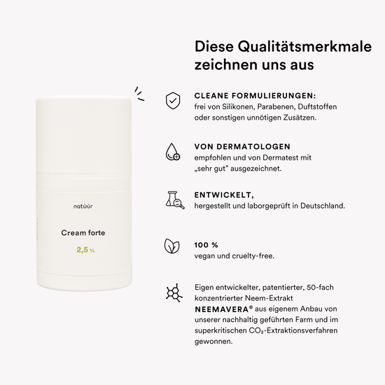 We produce our own neem extract NEEMAVERA in Germany using a specially developed process. This forms the basis for our skincare products – all scientifically developed and dermatologically tested.